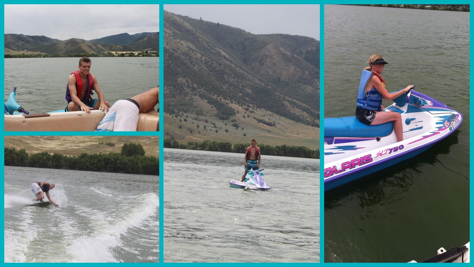 dear boating, FINALLY we made it out on the boat this summer! We have been trying to find a time we could all go. The boys have taken the wave runners to Mantua a few times but really wanted to do the boat. Dave was off and while I went on a run (I did hill repeats - ugh!) they got the boat ready. I hurried and got us a lunch packed and we headed off to Mantua. We would normally go to Willard Bay but it's basically closed because the water is too low this year. It was really nice because there were hardly any other boats out there! We took McKay and Marshall Parrish with us. Taylor invited Mitch and Maddie too, but they had to work. It was a lot of fun! The boys are amazing at wake boarding and I had fun zipping around on the wave runner. Dave just drove the boat. He's missing out! Last time I wake boarded was in Lake Powell and I'm not a huge fan of getting in Mantua and so I passed. I'm not a huge fan of it anyway. I like water skiing better. I did get pretty wet on the wave runner though.